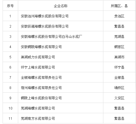 安徽省2016年度環(huán)保誠(chéng)信企業(yè)共11家水泥企業(yè);2016年環(huán)保良好企業(yè)共10家水泥企業(yè);2016年度環(huán)保警示企業(yè)為巢湖市中材安徽水泥有限公司。