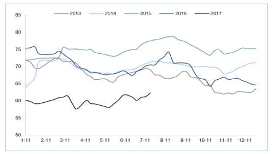2013-2017 年全國(guó)水泥庫(kù)容比(單位: %)