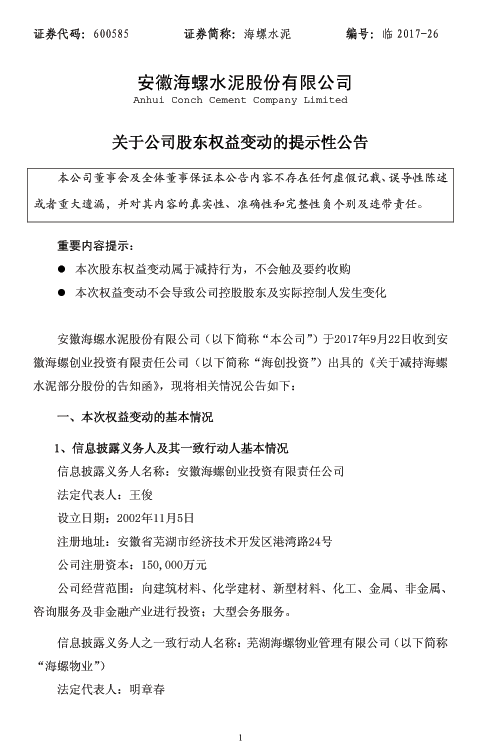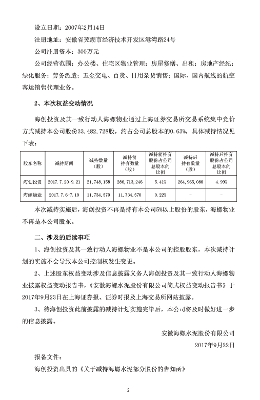 【水泥人網(wǎng)】海螺水泥昨日(22日)晚間公告,海創(chuàng)投資及其一致行動(dòng)人海螺物業(yè)以集中競(jìng)價(jià)方式減持公司股份33,482,728股,約占公司總股本的0.63%。