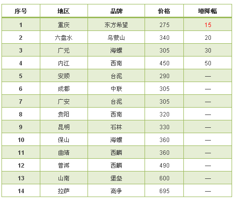 西南地區(qū),僅四川及重慶局部地區(qū)提價(jià)。因西南地區(qū)分布較廣,多為小區(qū)域市場(chǎng)。故價(jià)格差相對(duì)較大。從重慶地區(qū)的275元/噸到西藏拉薩的695元/噸,差價(jià)約420元/噸。