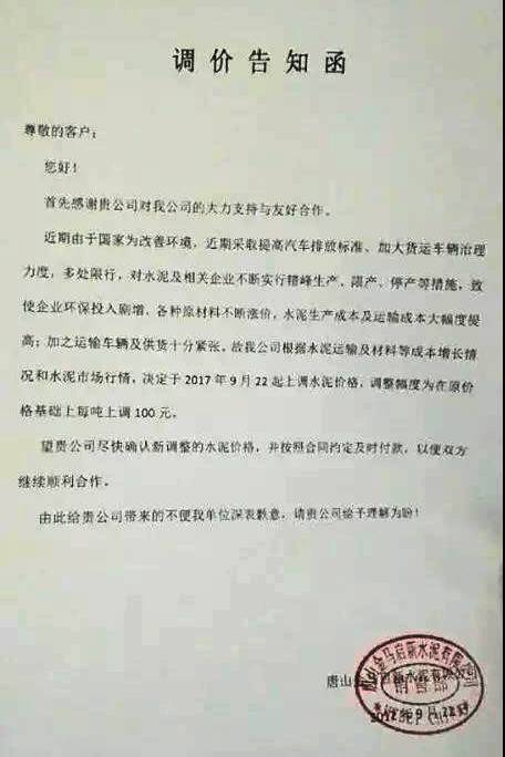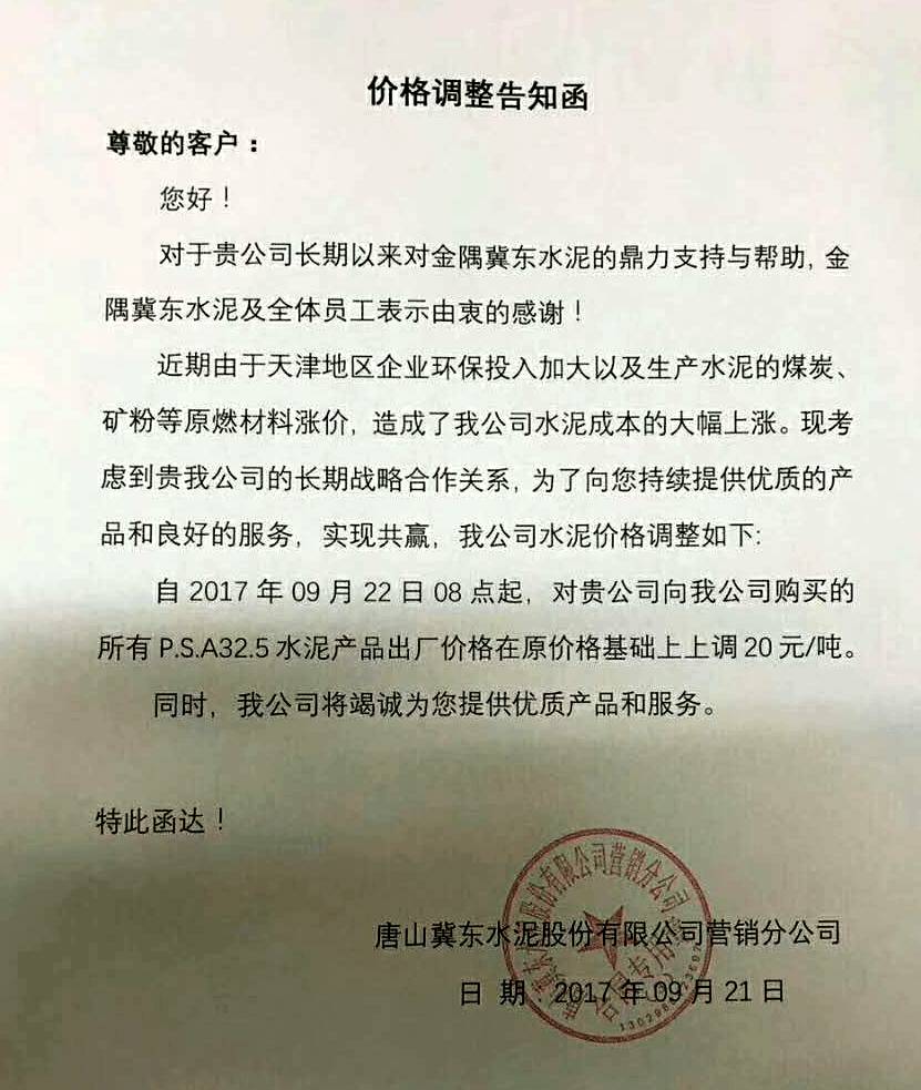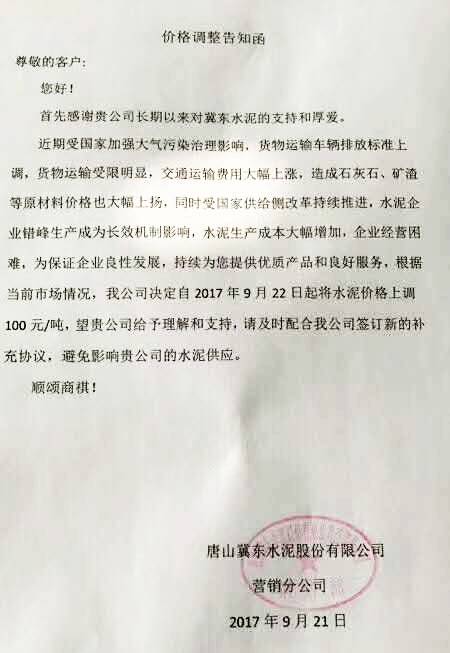 唐山冀東水泥股份有限公司 提價(jià)通知