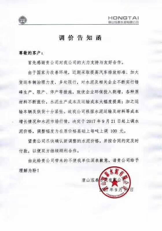唐山泓泰水泥有限公司提價(jià)通知