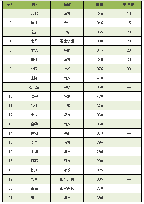 華中地區(qū)自14日各品種水泥上調(diào)30元/噸后僅永州蓮花水泥在17日發(fā)布提價(jià)通知稱各品種水泥提價(jià)30元/噸。提價(jià)后與區(qū)域內(nèi)其他企業(yè)價(jià)格基本持平。