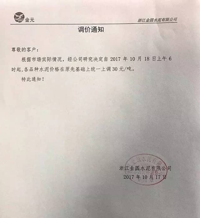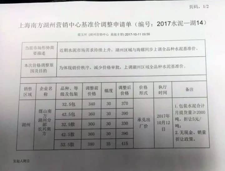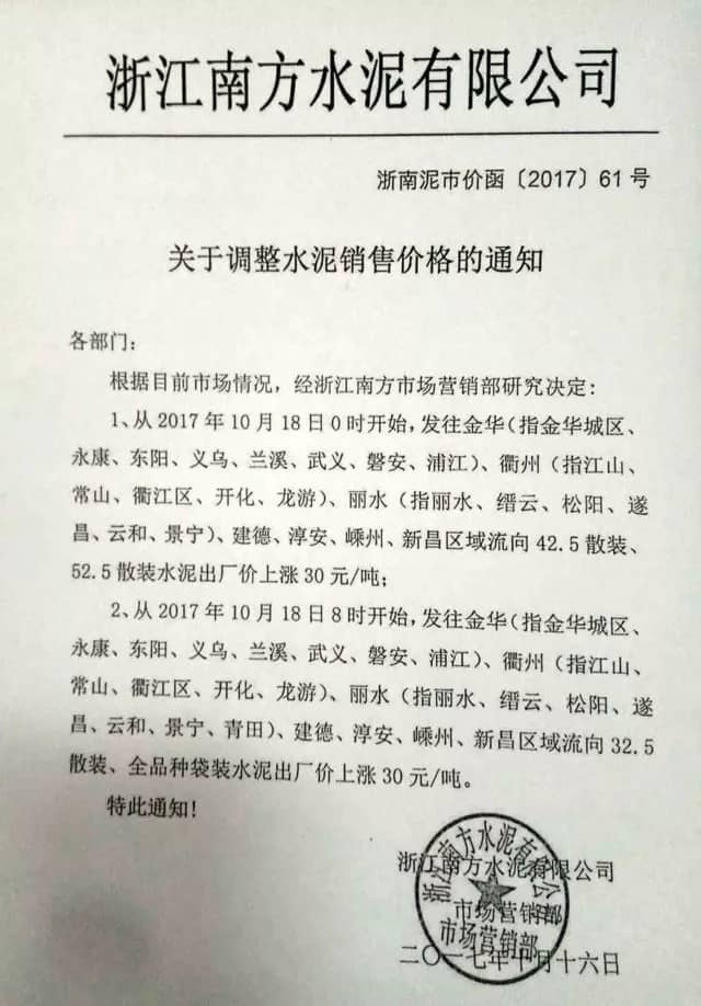 據(jù)悉,本次上調(diào)價(jià)格是由上海南方水泥領(lǐng)漲。上海南方水泥近期通知下屬企業(yè)及經(jīng)銷商稱:自2017年10月12日零時(shí)起,發(fā)往湖州區(qū)域的pc32.5R袋/散、po42.5袋/散水泥出廠價(jià)上調(diào)30元/噸;po52.5散水泥出廠價(jià)上調(diào)35元/噸。