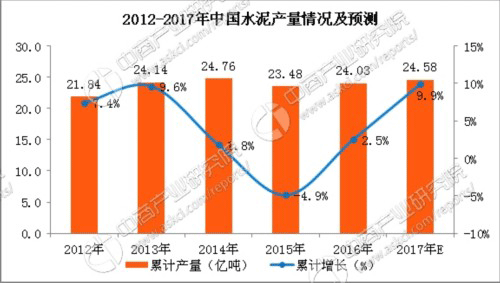 據(jù)中商產業(yè)研究院發(fā)布的《2017-2022年中國水泥行業(yè)市場前景及投資機會研究報告》數(shù)據(jù)統(tǒng)計顯示,2016年中國水泥累計產量為24.03億噸,累計增長2.5%;預計2017年中國水泥累計產量將達24.58億噸,累計增長約9.9%。據(jù)最新數(shù)據(jù)統(tǒng)計顯示,2017年9月中國水泥產量2.2億噸,同比下滑2%;2017年1-9月中國水泥產量17.6億噸,同比下滑0.5%。