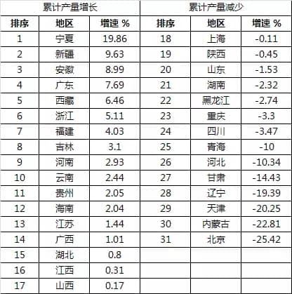 在各省市區(qū)水泥產(chǎn)量中,寧夏自治區(qū)水泥產(chǎn)量同比出現(xiàn)大幅提高,達(dá)19.86%,領(lǐng)先全國(guó)。而北京地區(qū)水泥產(chǎn)量同比下降最大,降幅達(dá)25.42%。