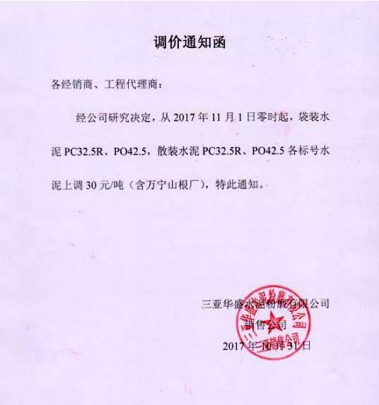 華南地區(qū)的三亞華盛水泥粉磨有限公司于本月初發(fā)布提價通知稱從2017年11月1日零時起,袋裝水泥PC32.5R、PO42.5,散裝水泥PC32.5R、PO42.5各標(biāo)號水泥上調(diào) 30元/噸(含萬寧山根廠)。