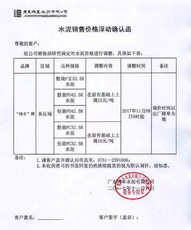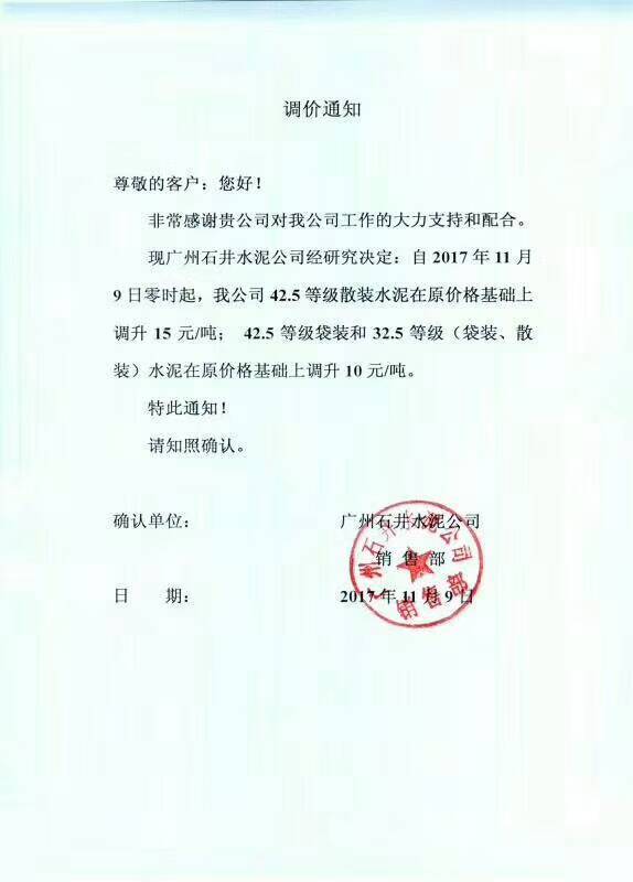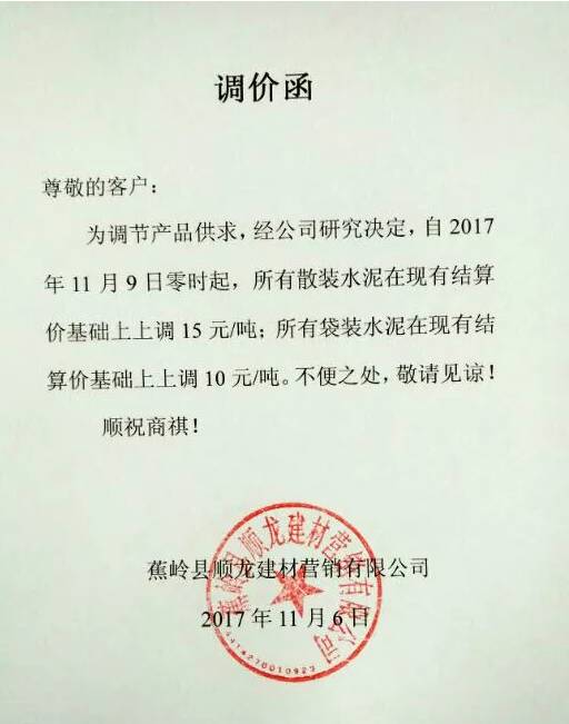 貴州金久水泥有限公司調(diào)價通知稱:由于煤炭價格上漲,運輸治超力度加大,造成水泥生產(chǎn)成本增加。經(jīng)公司研究決定于2017年11月2日早8點對PC32.5R袋裝,PC32.5散裝; PO42.5散裝; PO42.5袋裝價格分別上調(diào)20元/噸。