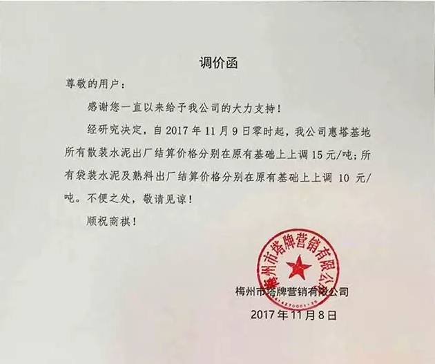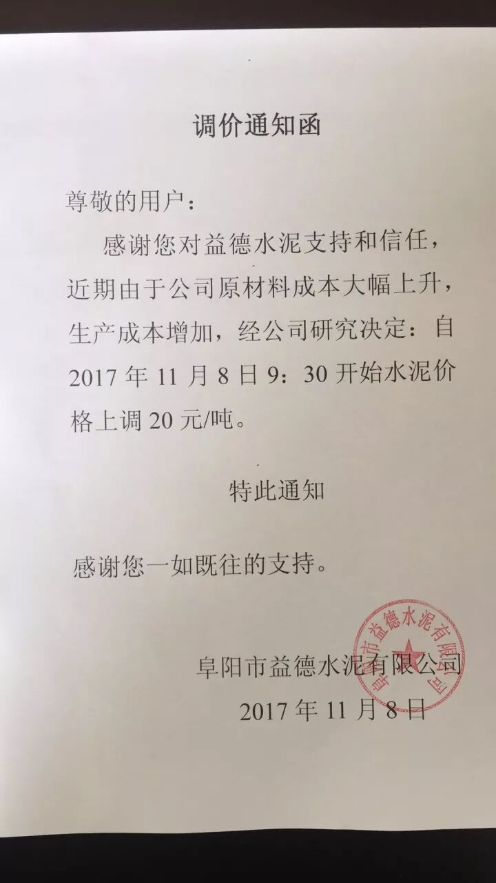 11月4日 河南省湖波水泥集團再度發(fā)出調(diào)價通知稱,由于環(huán)保嚴(yán)峻、錯鋒停產(chǎn)、節(jié)能減排、原材料上漲,經(jīng)集團研究決定,對各公司所有品種水泥上調(diào)50元/噸。執(zhí)行時間 為2017年11月4日早8點。