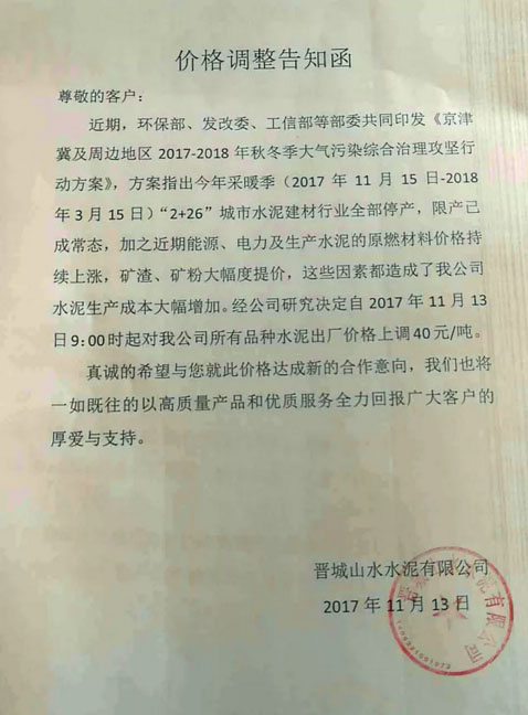 晉城山水水泥提價(jià)通知:近期,環(huán)保部、發(fā)改委、工信部等部委共同印發(fā)《京津冀及周邊地區(qū)2017-2018年秋冬季大氣污染綜合治理攻堅(jiān)行動方案》,方案指出今年采暖季(2017年11月15日-2018年3月15日)“2+26”城市水泥建材行業(yè)全部停產(chǎn),限產(chǎn)已成常態(tài),加之近期能源、電力及生產(chǎn)水泥的原燃料材料價(jià)格持續(xù)上漲,礦渣、礦粉大幅度提價(jià),這些因素都造成了我公司水泥生產(chǎn)成本大幅增加。經(jīng)公司決定自2017年11月13日9點(diǎn)對公司所有品種水泥出廠價(jià)格上調(diào)40元/噸。