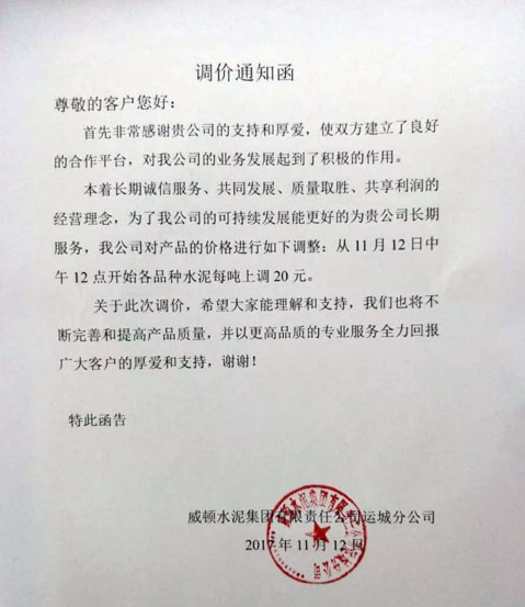 威頓水泥調(diào)價(jià)通知:自11月12日中午12點(diǎn)開始對旗下各品種水泥每噸上調(diào)20元。