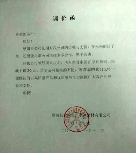 襄汾縣星源集團(tuán)水泥建材有限公司提價(jià)通知:所有型號水泥在原有基礎(chǔ)上每噸上調(diào)20元