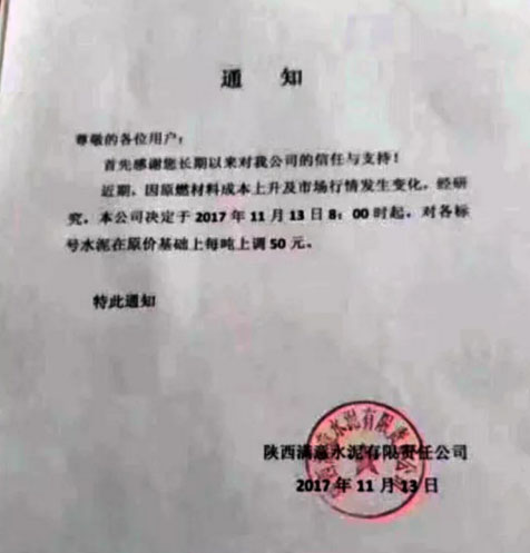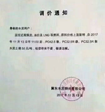 陜西聲威建材集團(tuán)有限公司銅川聲威建材有限責(zé)任公司提價(jià)通知:由于近期煤炭、LNG等主要材料價(jià)格大幅上漲,材料運(yùn)輸成本增加及環(huán)保等因素影響,水泥單位生產(chǎn)成本大幅度提高,為保證出廠產(chǎn)品質(zhì)量,維持公司生產(chǎn)正常運(yùn)行,經(jīng)研究決定,從2017年11月13日早10點(diǎn)起所有品種水泥出廠價(jià)格在原價(jià)格基礎(chǔ)上上漲50元/噸。