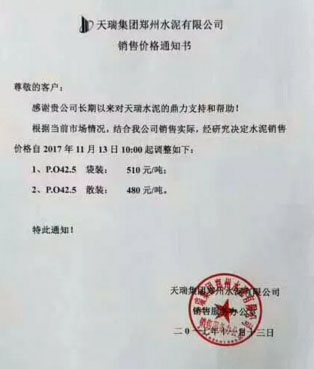 天瑞集團(tuán)鄭州水泥有限公司銷售價(jià)格通知:根據(jù)當(dāng)前市場,結(jié)合公司銷售實(shí)際,經(jīng)研究決定水泥銷售價(jià)格自2017年11月13日起調(diào)整為:P.O42.5袋裝510元/噸;P.O42.5散裝480元/噸。