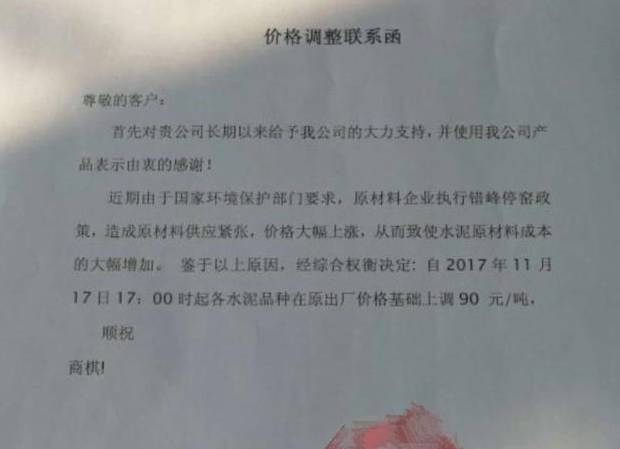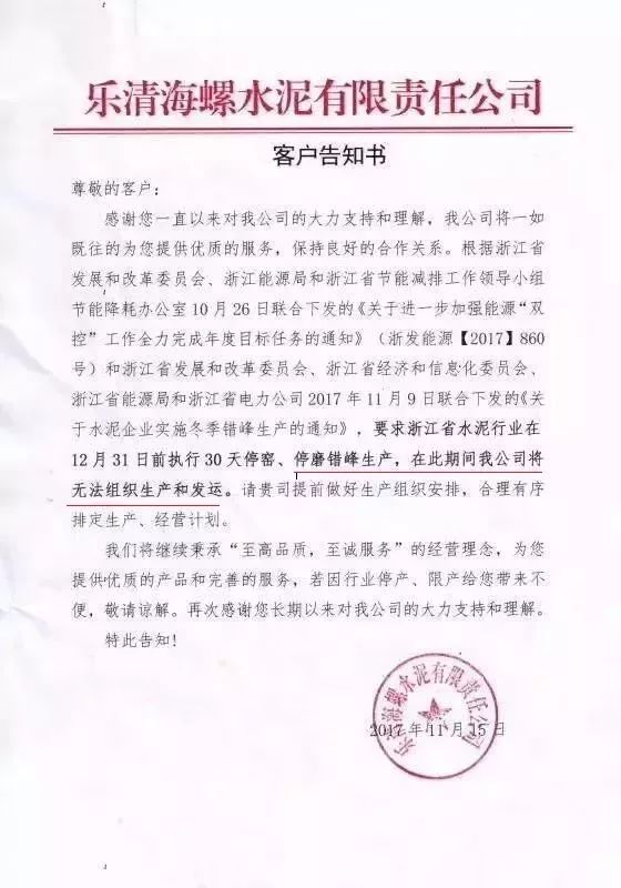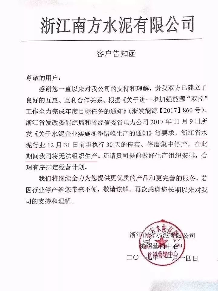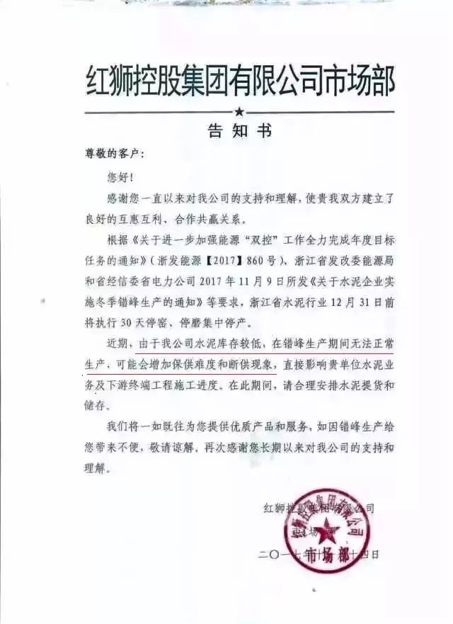 受此影響,華東浙江主導(dǎo)企業(yè)南方水泥、紅獅水泥、海螺水泥等企業(yè)向下游客戶發(fā)布告函稱:受區(qū)域錯(cuò)峰生產(chǎn)影響,將無(wú)法保證正常水泥供應(yīng),后期有可能斷貨停供。