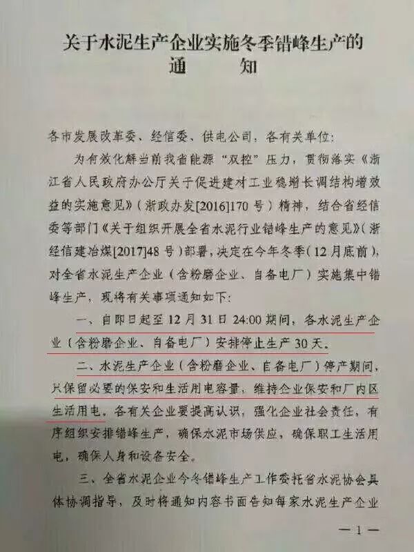 1 自即日起至12月31日24時(shí)期間,各水泥生產(chǎn)企業(yè)(含粉磨企業(yè)、自備電廠)安排停止生產(chǎn)30天。