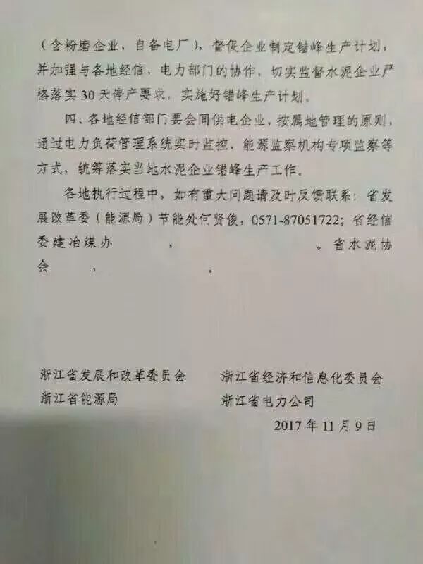據(jù)水泥人網(wǎng)了解,近期浙江省發(fā)改委、浙江省能源局、浙江省經(jīng)委、浙江省電力公司等聯(lián)合發(fā)布《關(guān)于水泥生產(chǎn)企業(yè)實(shí)施冬季錯(cuò)峰生產(chǎn)的通知》稱:為有效化解當(dāng)前浙江省能源“雙控”壓力,貫徹落實(shí)《浙江省人民政府辦公廳關(guān)于促進(jìn)建材工業(yè)穩(wěn)定增長(zhǎng)調(diào)結(jié)構(gòu)增效益的實(shí)施意見》精神,結(jié)合省經(jīng)信委等部門《關(guān)于組織開展全省水泥行錯(cuò)峰生產(chǎn)的意見》部署,決定在今年冬季(12月底前)、對(duì)全省水泥生產(chǎn)企業(yè)實(shí)施集中錯(cuò)峰停產(chǎn)。