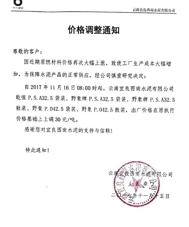 自2017年11月16日8時(shí)起,云南宜良西南水泥有限公司乾恒P.S.A32.5袋裝、野象牌P.S.A32.5袋裝、野象牌P.S.A32.5散裝、野象P.O42.5袋裝、野象P.O42.5散裝。出廠(chǎng)價(jià)格在原執(zhí)行價(jià)格基礎(chǔ)上上調(diào)30元/噸。