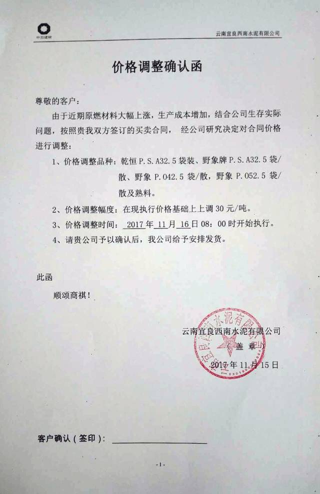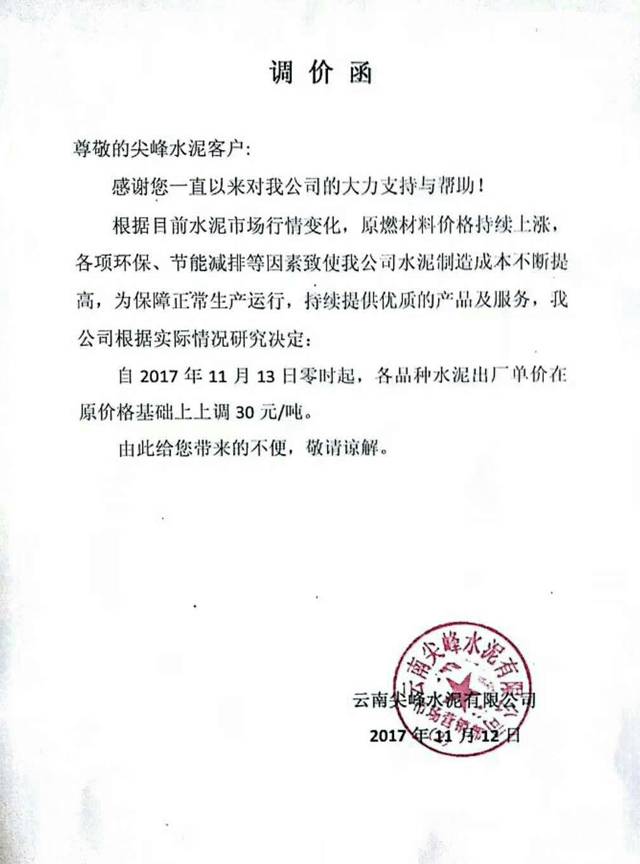 云南尖峰水泥有限公司調(diào)價(jià)函: