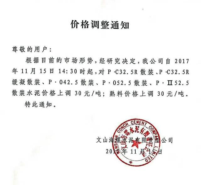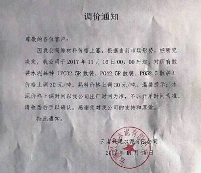 因公司原材料價(jià)格上漲,根據(jù)當(dāng)前市場(chǎng)形勢(shì),經(jīng)研究決定。我公司于2017年11月16日零時(shí)起,對(duì)所有散裝水泥品種價(jià)格上調(diào)30元,熟料價(jià)格上調(diào)30元/噸。