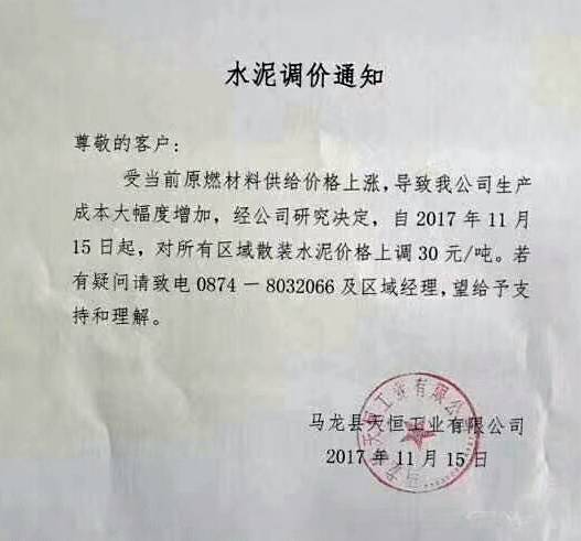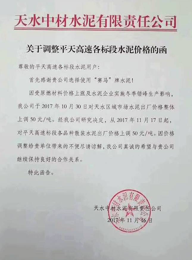 由于受原燃材料價(jià)格大幅上漲和水泥企業(yè)錯(cuò)峰生產(chǎn)的影響,公司已于2017年10月30日對(duì)天水區(qū)域市場(chǎng)各品種水泥出廠(chǎng)價(jià)格上調(diào)50元/噸。經(jīng)研究決定從2017年11月17日起,對(duì)平天高速各用戶(hù)各品種水泥出廠(chǎng)價(jià)格上調(diào)50元/噸。