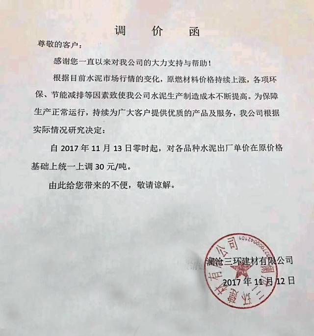 瀾滄三環(huán)建材有限公司調(diào)價(jià)函: