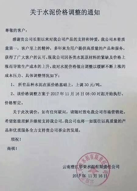 因各類(lèi)水泥原材料的緊缺及價(jià)格上漲而導(dǎo)致生產(chǎn)成本的上升,故對(duì)水泥價(jià)格做出調(diào)整以緩解不斷上漲的成本壓力。自2017年11月16日8時(shí)起所有品種水泥在原價(jià)格基礎(chǔ)上上調(diào)30元/噸。