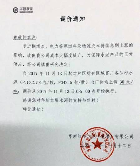 華新紅塔水泥(景洪)有限公司調(diào)價(jià)通知: