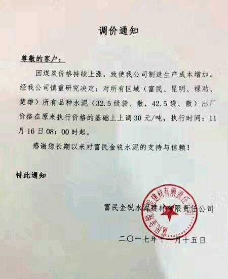 富民金銳水泥建材限責(zé)任公司調(diào)價(jià)通知: