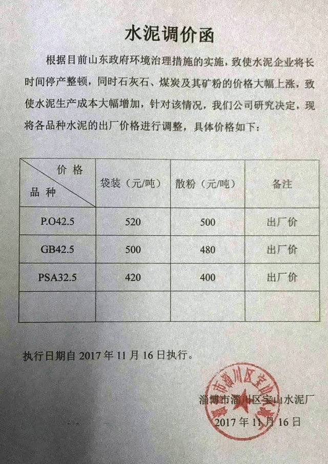 根據(jù)目前山東政府環(huán)境治理措施的實(shí)施,致使水泥企業(yè)將長(zhǎng)時(shí)間停產(chǎn)整頓,同時(shí)石灰石、煤炭及其礦粉的價(jià)格大幅上漲,致使水泥生產(chǎn)成本大幅增加,針對(duì)該情況,公司研究決定將各品種水泥的出廠(chǎng)價(jià)格進(jìn)行調(diào)整 。
