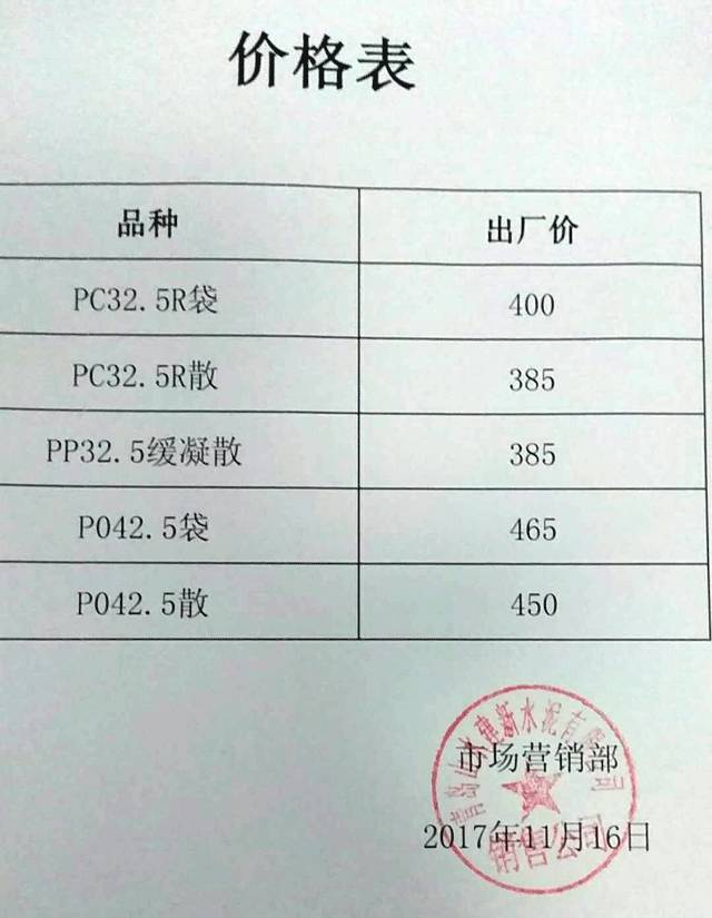 青島市山水建新水泥有限公司市場(chǎng)營(yíng)銷(xiāo)部?jī)r(jià)格表: