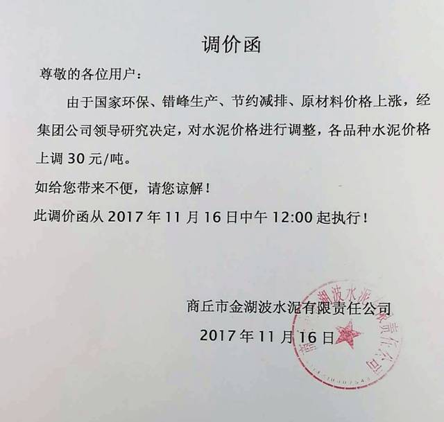 商丘金湖波水泥有限責(zé)任公司調(diào)價(jià)函: