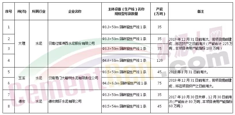 【水泥人網(wǎng)】按照《國(guó)務(wù)院關(guān)于化解產(chǎn)能嚴(yán)重過剩矛盾的指導(dǎo)意見》(國(guó)發(fā)〔2013〕41號(hào))、《國(guó)務(wù)院辦公廳關(guān)于促進(jìn)建材工業(yè)穩(wěn)增長(zhǎng)調(diào)結(jié)構(gòu)增效益的指導(dǎo)意見》(國(guó)辦發(fā)〔2016〕34號(hào))及《工業(yè)和信息化部關(guān)于印發(fā)部分產(chǎn)能嚴(yán)重過剩行業(yè)產(chǎn)能置換實(shí)施辦法的通知》(工信部產(chǎn)業(yè)〔2015〕127號(hào))、《工業(yè)和信息化部國(guó)家發(fā)改委關(guān)于印發(fā)水泥行業(yè)部分項(xiàng)目處理意見的通知》(工信部聯(lián)原〔2016〕118號(hào))、《云南省人民政府辦公廳關(guān)于嚴(yán)格落實(shí)產(chǎn)能置換著力化解水泥行業(yè)產(chǎn)能過剩矛盾的實(shí)施意見》(云政辦發(fā)〔2017〕44號(hào))的有關(guān)要求,云南紅塔滇西水泥股份有限公司賓川分公司日產(chǎn)6000噸、云南易門大椿樹水泥有限責(zé)任公司日產(chǎn)4000噸、盈江昆鋼榕全水泥有限公司日產(chǎn)2000噸新型干法水泥熟料建設(shè)項(xiàng)目產(chǎn)能置換方案已經(jīng)省人民政府確認(rèn),現(xiàn)予公告,詳見附件。