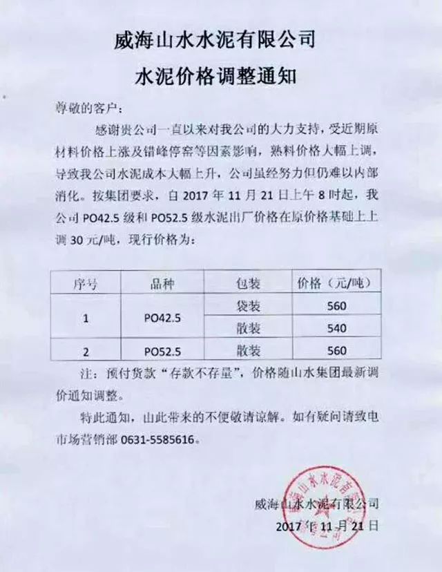 【水泥人網(wǎng)】近日,山東省的水泥熟料價(jià)格大漲,多家企業(yè)通知下游客戶價(jià)格上調(diào)。其中威海山水水泥有限公司水泥價(jià)格調(diào)整通知稱,受近期原材料價(jià)格上漲及錯(cuò)峰停窯因素影響,熟料價(jià)格大幅上調(diào),導(dǎo)致公司水泥成本大幅上升。公司雖經(jīng)努力但仍難以內(nèi)部消化。按集團(tuán)要求自2017年11月21日上午8時(shí)起,PO42.5級(jí)和PO52.5級(jí)水泥出廠價(jià)格在原價(jià)格基礎(chǔ)上上調(diào)30元/噸?,F(xiàn)行價(jià)格PO42.5水泥袋裝價(jià)格560元/噸,散裝價(jià)格540元/噸。PO52.5散裝水泥560元/噸。