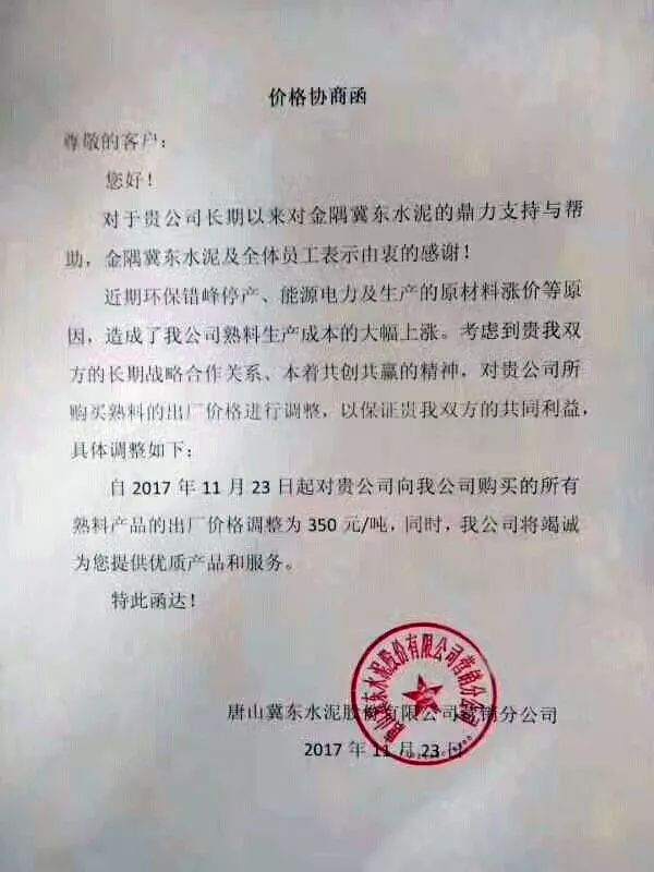 河北省主導(dǎo)企業(yè)唐山冀東水泥于昨日發(fā)布了熟料價(jià)格協(xié)商函,《價(jià)格協(xié)商函》稱因近期環(huán)保錯(cuò)峰停產(chǎn)、能源電力及生產(chǎn)的原材料漲價(jià)等原因,造成了公司熟料生產(chǎn)成本的大幅上漲。考慮到長期戰(zhàn)略合作關(guān)系,本著共贏的精神,自23日起熟料出廠價(jià)格上調(diào)為350元/噸 。