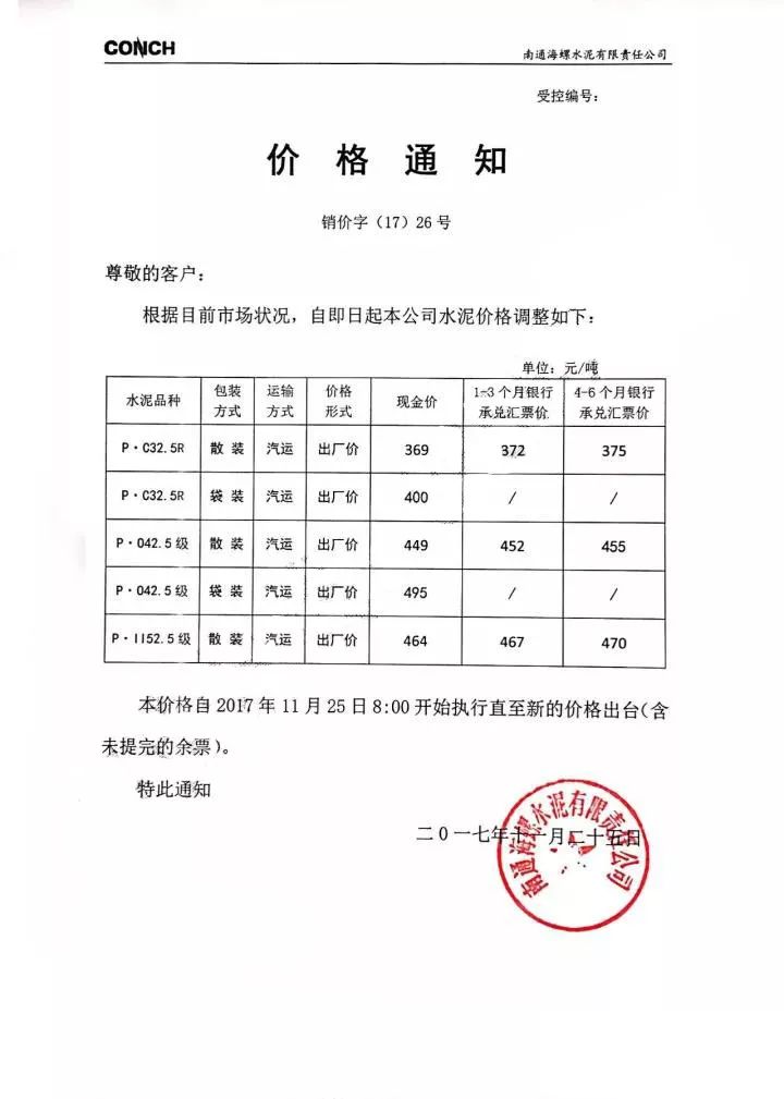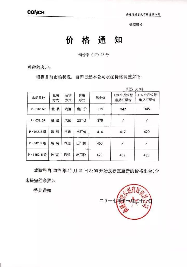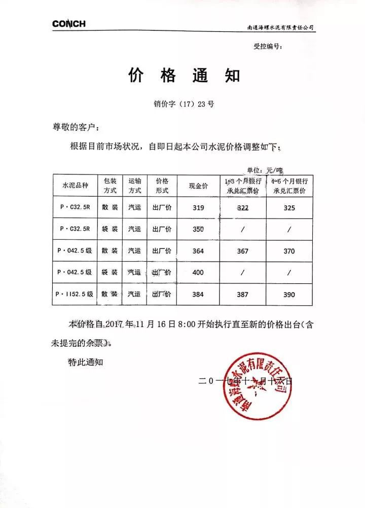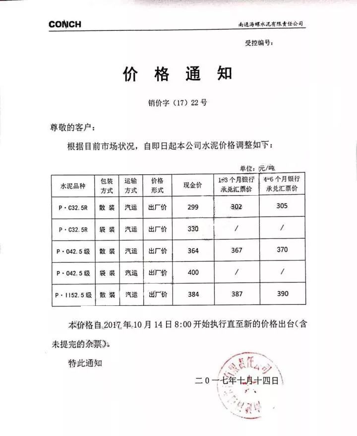 南通海螺水泥本月已經(jīng)五次發(fā)布提價通知,本月內(nèi)PO42.5散裝水泥漲近100元/噸。漲價通知如下: