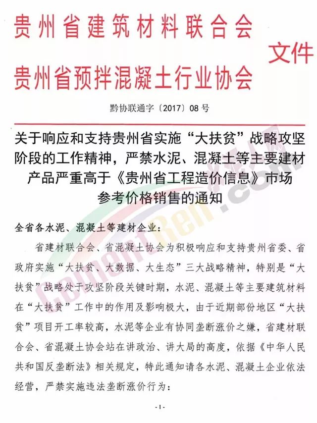 昨日(5日)貴州省建筑材料聯(lián)合會(huì),貴州省預(yù)拌混凝土行業(yè)協(xié)會(huì)發(fā)布《關(guān)于響應(yīng)和支持貴州實(shí)施”大扶貧“戰(zhàn)略攻堅(jiān)階段的工作精神,嚴(yán)禁水泥、混凝土等主要建材產(chǎn)品嚴(yán)重高于《貴州省工程造價(jià)信息》市場(chǎng)參考價(jià)格銷售的通知。通知稱:省建材聯(lián)合會(huì)、省混凝土協(xié)會(huì)為積極響應(yīng)和支持貴州省委、省政府實(shí)施“大扶貧、大數(shù)據(jù)、大生態(tài)”三大戰(zhàn)略精神,特別是“大扶貧”戰(zhàn)略處于攻堅(jiān)階段關(guān)鍵時(shí)期,水泥、混凝土等主要建筑材料在“大扶貧”工作中的作用及影響極大,由于近期部分地區(qū)“大扶貧”項(xiàng)目開工率較高,水泥等企業(yè)有協(xié)同壟斷漲價(jià)之嫌,省建材聯(lián)合會(huì)、省混凝土協(xié)會(huì)站在講政治、講大局的高度,依據(jù)《中華人民共和國(guó)反壟斷法》相關(guān)規(guī)定通知各水泥‘混凝土企業(yè)依法經(jīng)營(yíng),嚴(yán)禁實(shí)施違法壟斷漲價(jià)行為。