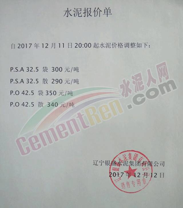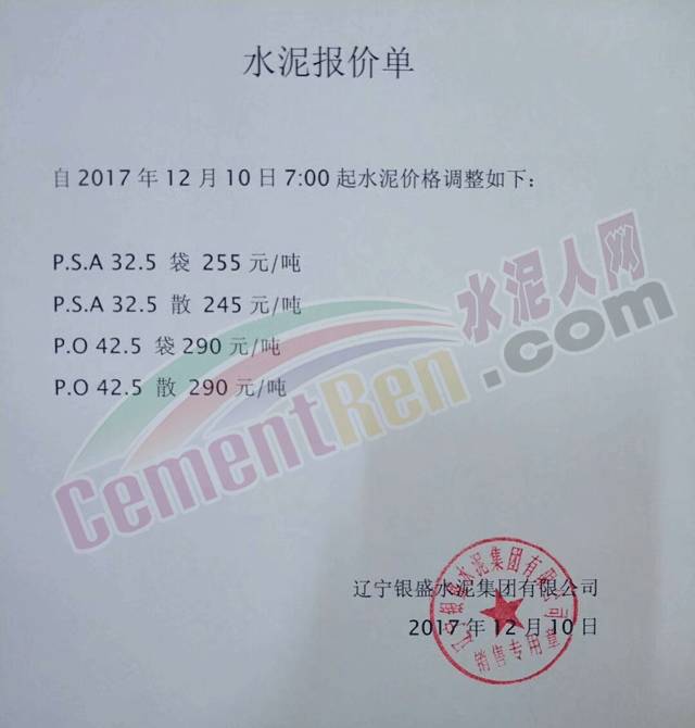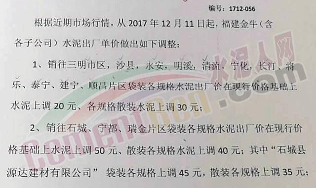 12月11日通知稱,根據(jù)市場(chǎng)行情,從11日起福建金牛(含子公司)水泥出廠單價(jià):銷往三明市區(qū)、沙縣、永安、明溪、清流、寧化、長(zhǎng)汀、將樂、泰寧、建寧、順昌片區(qū)袋裝各規(guī)格水泥出廠價(jià)在現(xiàn)行價(jià)格基礎(chǔ)上上調(diào)20元/噸,各規(guī)格散裝水泥上調(diào)30元/噸。銷往石城、寧都、瑞金片區(qū)袋裝各規(guī)格水泥出廠價(jià)在現(xiàn)行價(jià)格基礎(chǔ)上上調(diào)50元/噸、散裝各規(guī)格水泥上調(diào)40元/噸。其中石城縣源達(dá)建材有限公司袋裝各規(guī)格上調(diào)45元/噸,散裝各規(guī)格上調(diào)35元/噸。