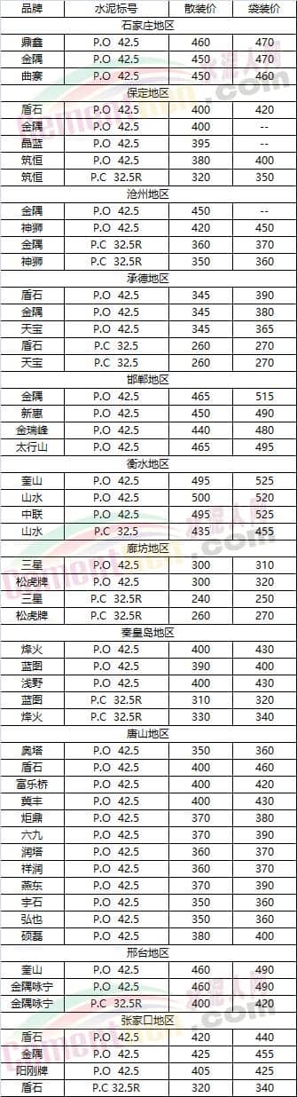 河北省部分地區(qū)水泥參考價