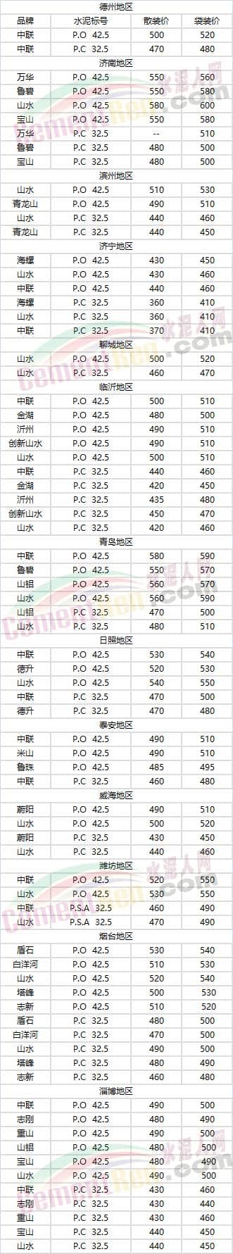 山東省部分地區(qū)水泥參考價