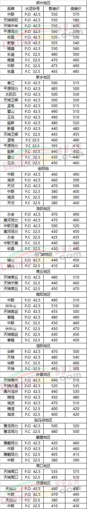 河南省部分地區(qū)水泥市場參考價