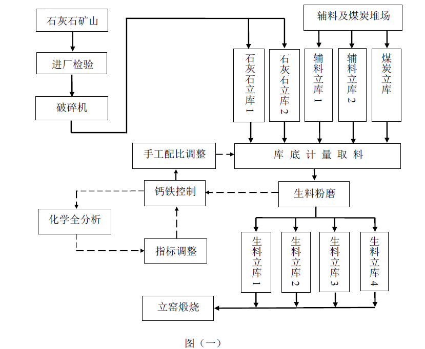 “圖一”是傳統(tǒng)的立窯黑生料質(zhì)量控制圖,入磨石灰石以及入窯生料只是依靠簡單的多庫搭配,出磨生料進(jìn)行鈣鐵控制,每小時檢驗(yàn)一次,根據(jù)出磨生料的鈣鐵檢驗(yàn)數(shù)據(jù)進(jìn)行原料配比調(diào)整,出磨生料24小時綜合樣進(jìn)行化學(xué)全分析,得到生料的三率值,然后進(jìn)行鈣鐵目標(biāo)值調(diào)整,用于后期的出磨生料過程質(zhì)量控制。