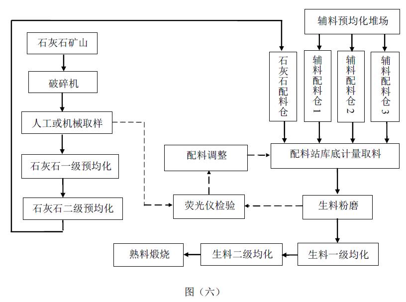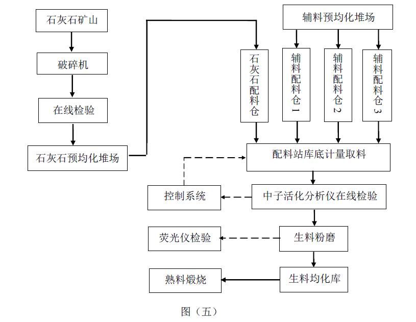 “圖五”是目前比較先進(jìn)的水泥生料質(zhì)量控制圖,在好多大企業(yè)得到應(yīng)用,進(jìn)廠石灰石經(jīng)破碎后在傳送帶上用中子活化分析儀進(jìn)行在線檢驗(yàn),經(jīng)均化后進(jìn)入配料站。在配料站的庫底進(jìn)行計量取料,用中子活化分析儀對傳送帶上的所有入磨混合物料進(jìn)行在線檢驗(yàn),一分鐘提供一次檢驗(yàn)數(shù)據(jù),同時配備的控制系統(tǒng)一分鐘自動調(diào)整一次原料配比,出磨生料同樣需要熒光儀檢驗(yàn),防止失控。