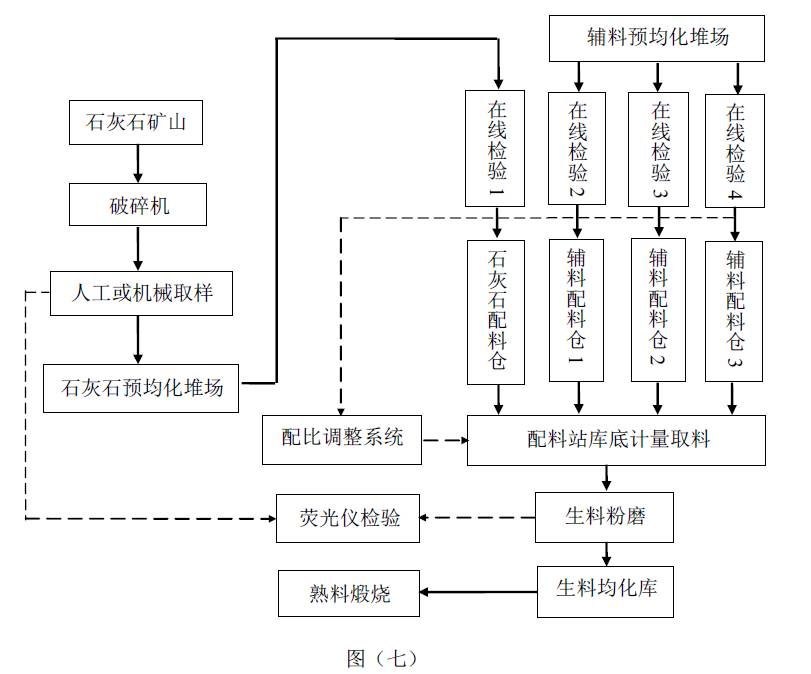 實(shí)現(xiàn)水泥生料前置控制,一直是有關(guān)專家和企業(yè)技術(shù)人員的夢想,“圖七”是前置全檢型水泥生料質(zhì)量控制思路,將所有的入磨物料全部進(jìn)行在線檢驗(yàn),提前確定入磨物料的原料配比,這是多年前有關(guān)業(yè)內(nèi)人士提出的設(shè)想,屬于前置式的生料質(zhì)量控制,可走出事后調(diào)整的誤區(qū),控制思路是先進(jìn)的,但是有幾個問題應(yīng)該注意: