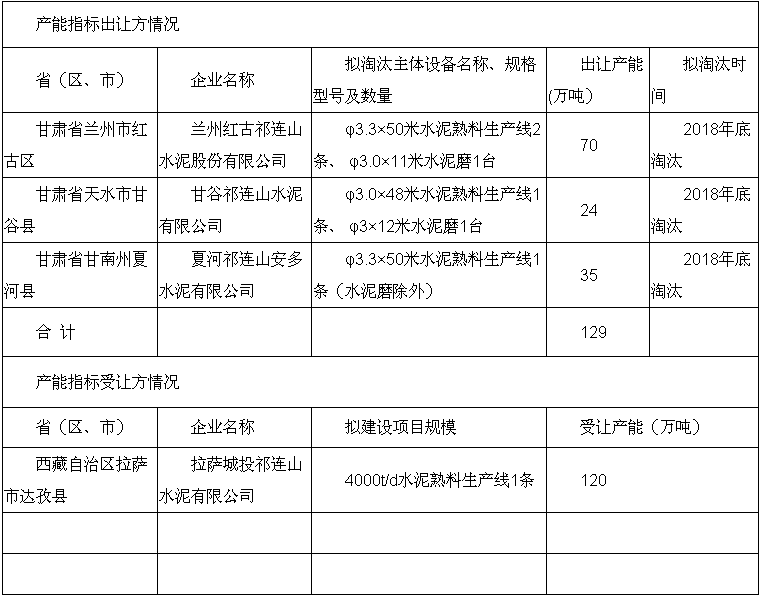 甘肅省水泥熟料產(chǎn)能轉(zhuǎn)出情況表