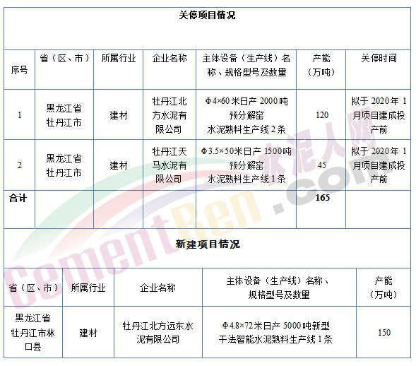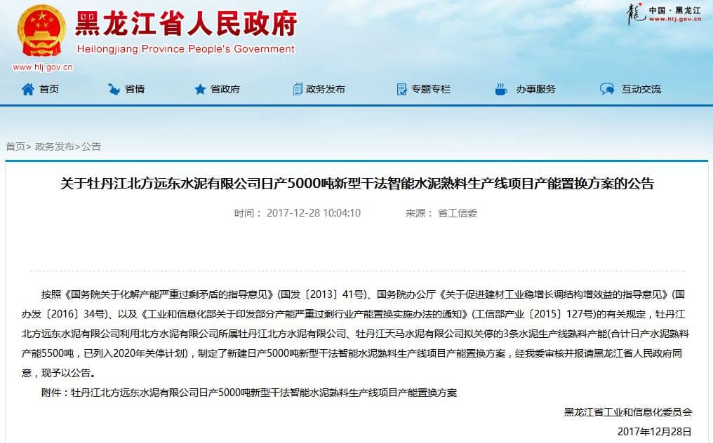 【水泥人網(wǎng)】昨日(28日)黑龍江省工信委公布了牡丹江北方遠東水泥有限公司日產(chǎn)5000噸新型干法智能水泥熟料生產(chǎn)線項目產(chǎn)能置換方案,并在當?shù)卣倬W(wǎng)公告。