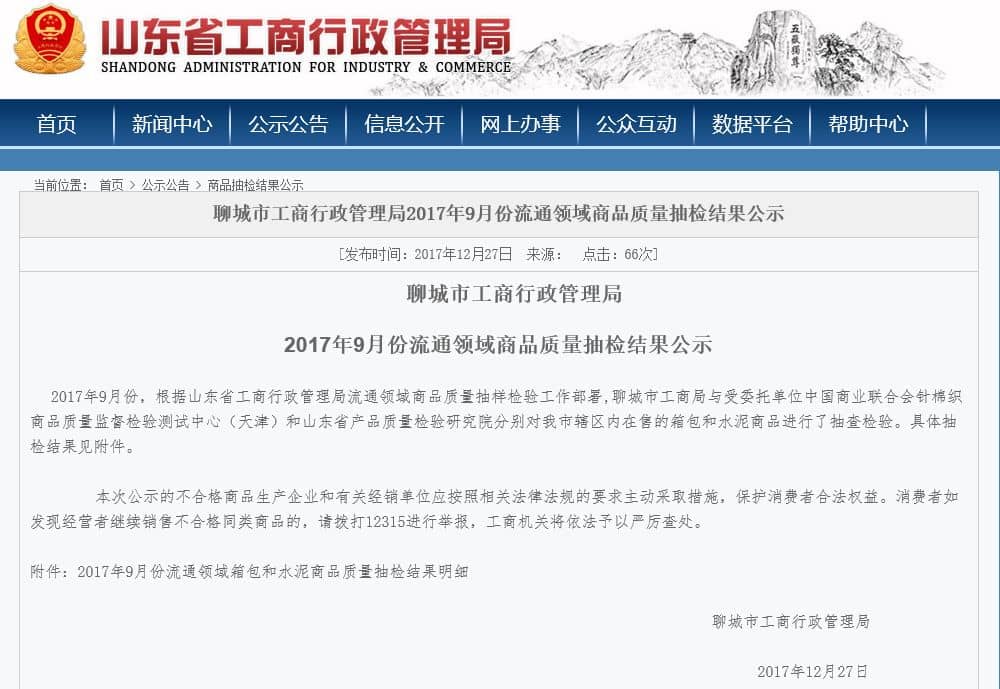 結(jié)果顯示,2017年9月份,根據(jù)山東省工商行政管理局流通領(lǐng)域商品質(zhì)量抽樣檢驗工作部署,聊城市工商局與受委托單位中國商業(yè)聯(lián)合會針棉織商品質(zhì)量監(jiān)督檢驗測試中心(天津)和山東省產(chǎn)品質(zhì)量檢驗研究院分別對聊城市轄區(qū)內(nèi)在售的水泥商品進行了抽查檢驗。