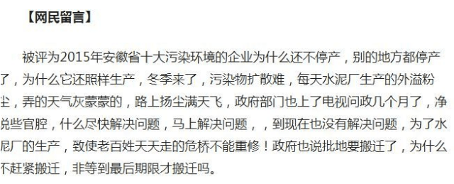 被評為2015年安徽省十大污染環(huán)境的企業(yè)為什么還不停產(chǎn),別的地方都停產(chǎn)了,為什么它還照樣生產(chǎn),冬季來了,污染物擴散難,每天水泥廠生產(chǎn)的外溢粉塵,弄的天氣灰蒙蒙的,路上揚塵滿天飛,政府部門也上了電視問政幾個月了,凈說些官腔,什么盡快解決問題,馬上解決問題,,到現(xiàn)在也沒有解決問題,為了水泥廠的生產(chǎn),致使老百姓天天走的危橋不能重修!政府也說批地要搬遷了,為什么不趕緊搬遷,非等到最后期限才搬遷嗎。