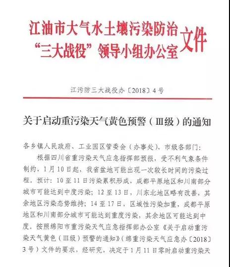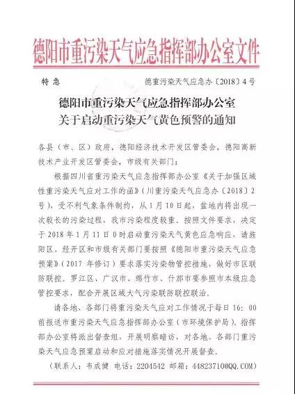 根據(jù)省環(huán)境監(jiān)測總站和省氣象臺會商研判,成都、自貢、瀘州、德陽、綿陽、遂寧、內(nèi)江、樂山、 宜賓、達州、雅安、眉山、資陽13個城市將采取聯(lián)防聯(lián)控措施,于1月11曰零時同步啟動重污染天氣黃色預(yù)警。