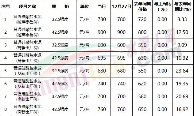 高爭建材、華新水泥、高新雪蓮等水泥生產(chǎn)企業(yè),針對(duì)全區(qū)重點(diǎn)項(xiàng)目執(zhí)行政府指導(dǎo)價(jià),分別為普通硅酸鹽32.5(強(qiáng)度)500元、普通硅酸鹽42.5(強(qiáng)度)600元、普通硅酸鹽52.5(強(qiáng)度)800元,與上周持平。
